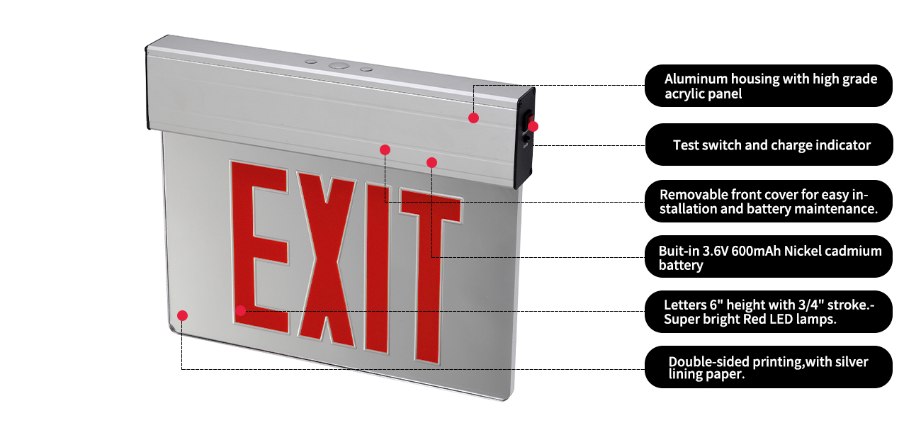 *আলোকসজ্জা - এই এজ লিট প্রস্থান সাইন সিরিজ একটি দীর্ঘ জীবনের নেতৃত্বাধীন আলোকসজ্জা সরবরাহ করে। ইউনিটটি একটি লাল উচ্চ আউটপুট এলইডি বোর্ড দিয়ে নির্মিত হয়।  কেবলমাত্র মডেল ইউনিটগুলির জন্য শক্তি খরচ 3 ওয়াটেরও কম রেট দেওয়া হয়। ব্যাটারি ব্যাকআপ ইউনিট শক্তি খরচ 1 ওয়াটেরও কম রেট দেওয়া হয়।