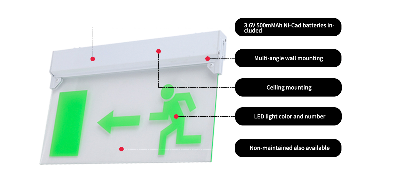 *জরুরী পাওয়ার ব্যাটারি ব্যাকআপ- এলইডি প্রস্থান সাইনটি রক্ষণাবেক্ষণ-মুক্ত 3.6V 500 এমএএইচ নি-ক্যাড ব্যাটারি দিয়ে ডিজাইন করা হয়েছে যা সর্বনিম্ন জরুরী সময়কাল 6 ঘন্টা সরবরাহ করে। ব্যাটারির রিচার্জ সময় 24 ঘন্টা।